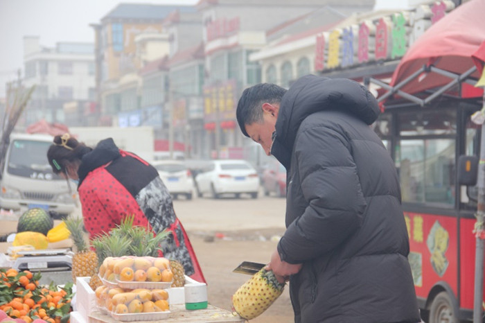 一名水果商贩在帮买主削菠萝。赣榆地处江苏北部,但全国各地的水果都能买到