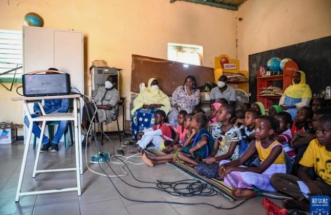 2021年11月22日,在塞内加尔达喀尔近郊的辛迪亚小学,同学们课间坐在教室的地毯上观看投影播放的动画片。新华社记者 李琰 摄
