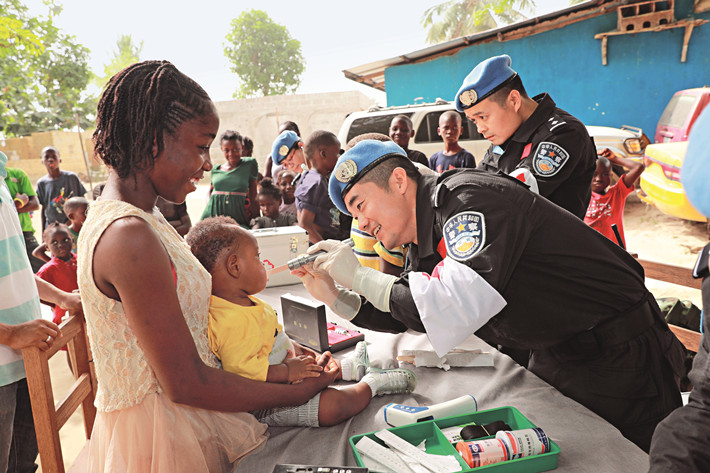 在利比里亚蒙罗维亚,中国第五支驻利比里亚维和警察防暴队派出医护人员为本森威尔社区孤儿院的儿童和员工进行义诊。(新华社)