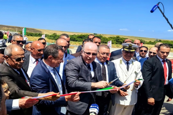 8月12日,在阿尔及利亚塔夫省,阿尔及利亚总理阿卜杜拉赫曼(前左三)出席阿尔及利亚东西高速公路东标段84公里项目通车仪式并剪彩。新华社发(中信建设供图)