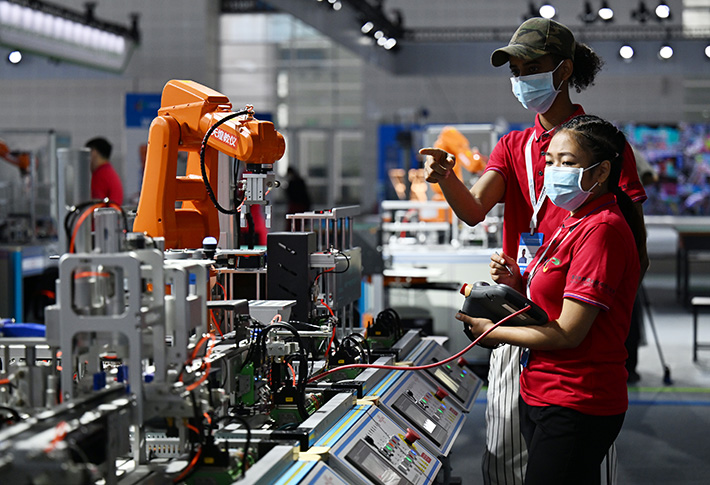 2022年8月19日,天津,首届世界职业院校技能大赛的参赛选手在国家会展中心(天津)操作机械设备。(图片来源:新华社)
