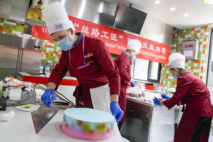 2019年6月26日,北京,首届“丝路工匠”国际技能大赛的俄罗斯参赛选手参加蛋糕裱花比赛。(图片来源:新华社)