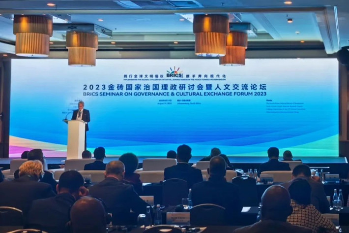 19日,2023金砖国家治国理政研讨会暨人文交流论坛在南非最大城市约翰内斯堡举办。活动由中共中央宣传部、中国外文局、南非国家行政学院、南非人文科学研究理事会共同主办。来自中国、俄罗斯、印度、巴西、南非五个金砖国家100余名代表出席,围绕“践行全球文明倡议,携手奔向现代化”主题展开研讨交流。