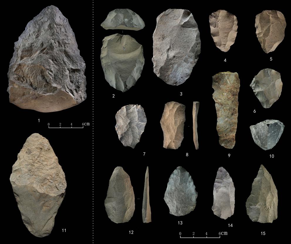 1.手斧 2-6.勒瓦娄哇石核(循环剥片法、优先剥片法) 7.勒瓦娄哇石片 8.勒瓦娄哇石叶 9.石叶 10.锥形石叶石核 11.手镐 12-15.勒瓦娄哇尖状器 (图片来源:中肯联合考古队)