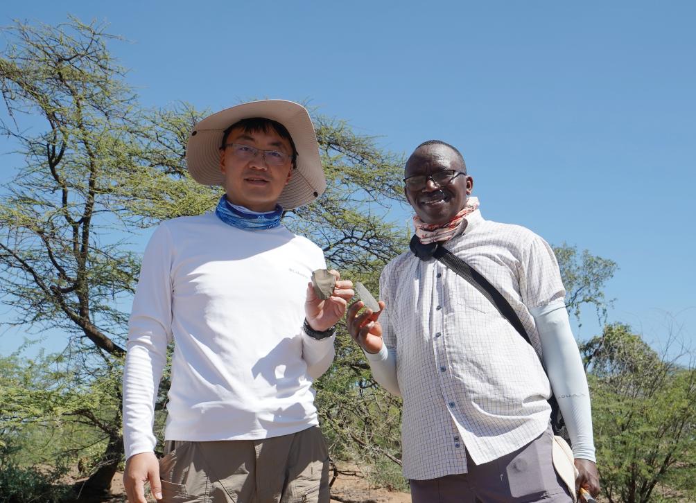 中方现场负责人赵清坡(左)与肯方负责人Job Kibii(右)展示新发现的典型勒瓦娄哇石核(左)和勒瓦娄哇尖状器(右)。(图片来源:中肯联合考古队)
