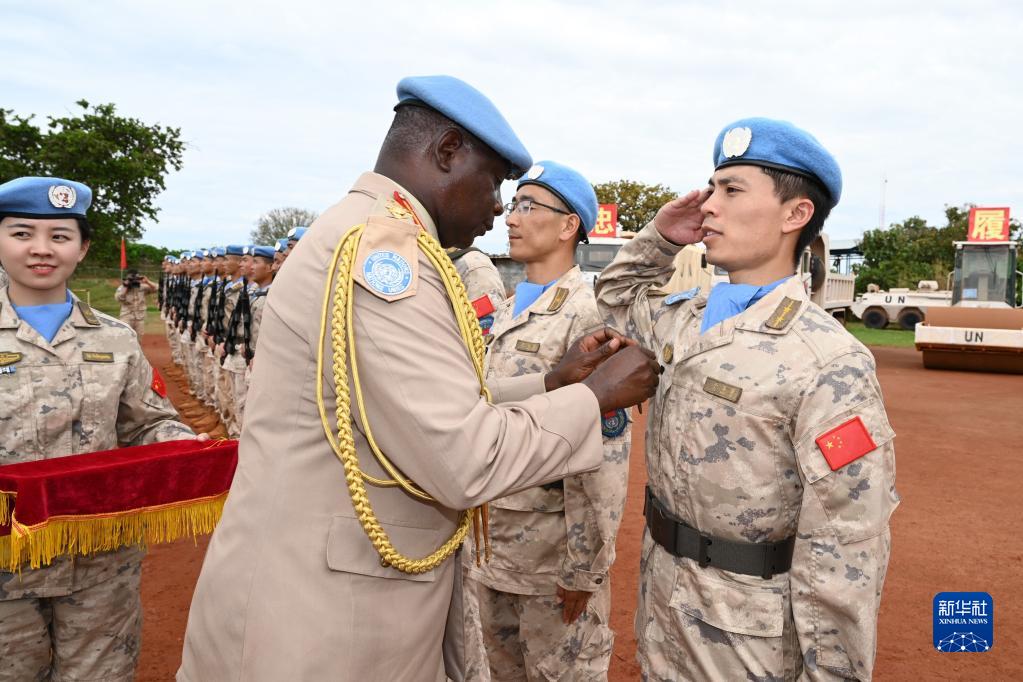 授勋仪式上,联南苏团西战区高层为中国维和部队官兵代表颁发司令嘉奖,并授予全体官兵“和平荣誉勋章”。