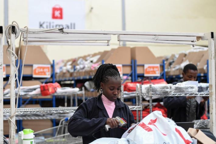 2023年7月28日,在肯尼亚姆洛隆戈,湖南长沙非拓信息技术有限公司旗下电商平台Kilimall的员工在仓库内分拣货物。(图片来源:新华社)