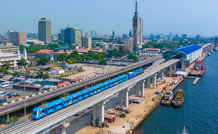 2022年12月21日,在尼日利亚拉各斯轻轨项目竣工仪式上,一列中国建造的列车正在行驶