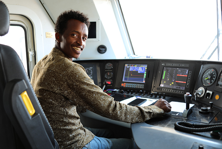 2022年9月19日,亚吉铁路沿线的吉布提纳加德火车站,一名司机在列车运行前做准备工作
