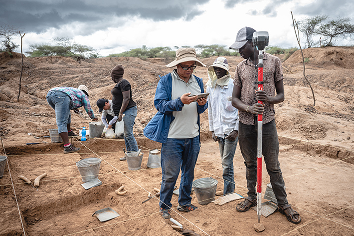 113日,中肯联合考古队队员顾雪军(右三)在位于肯尼亚巴林戈郡马里加特镇的考古现场测量石器坐标位置