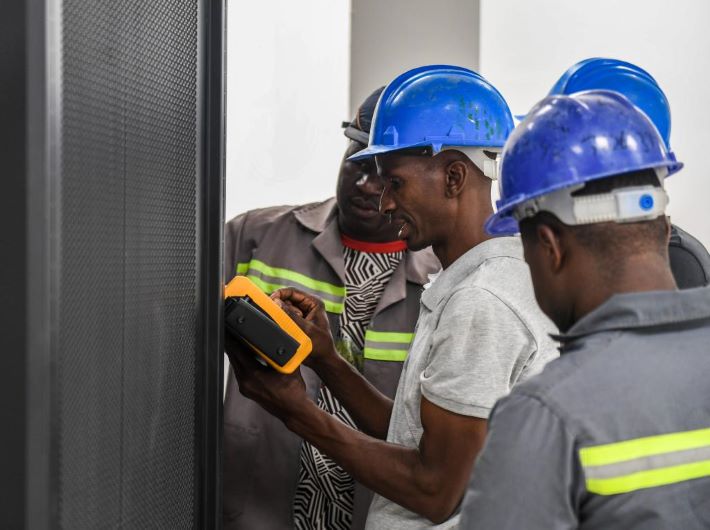 2023年9月11日,在博茨瓦纳首都哈博罗内,工人在博茨瓦纳国家数据中心的数据库房工作。由中国江西国际经济技术合作公司博茨瓦纳分公司承建的博茨瓦纳国家数据中心项目位于哈博罗内科技园区,预计今年年底前竣工验收。(图片来源:新华社)