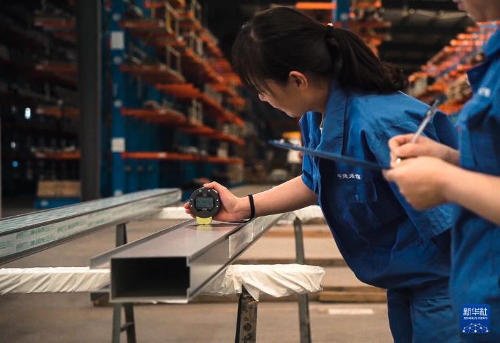 2023年8月17日,工作人员在位于武汉的中建装饰幕墙加工厂检查出口型材涂层膜厚度。(图片来源:新华社)