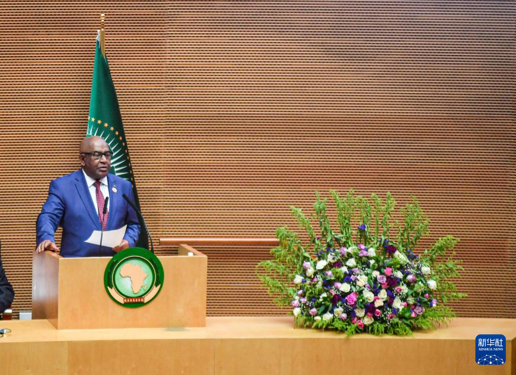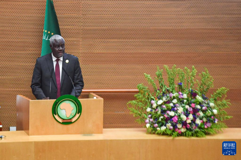 2月17日,在埃塞俄比亚首都亚的斯亚贝巴,非盟委员会主席法基在开幕式上发言。(图片来源:新华社)