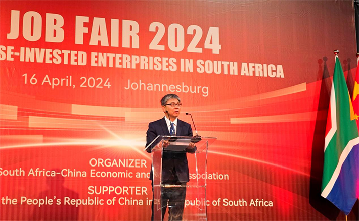 4月16日,2024中资企业招聘大会在约翰内斯堡成功举行。中国驻南非使馆临时代办李志刚应邀出席并致辞,南非内阁部长、在南中资企业代表、南高校学生和社会求职者、媒体记者等约2800人出席。