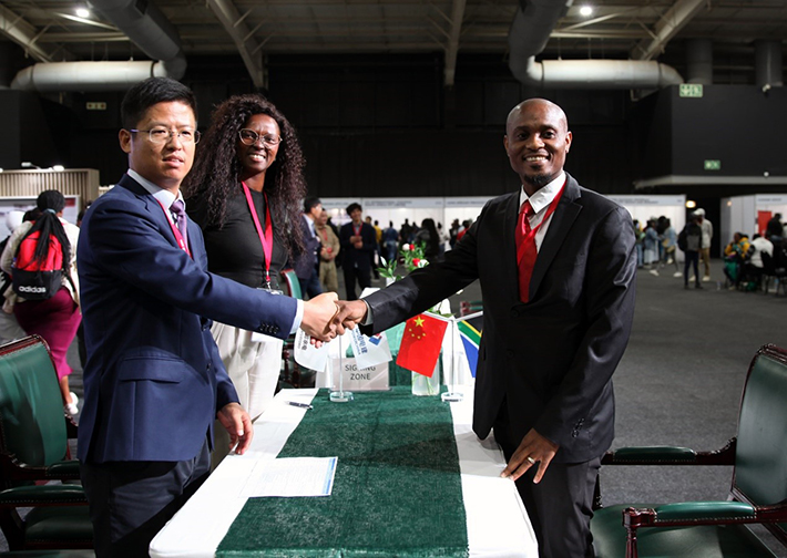 Simphiwe Zondi与中国电建国际公司南非国别代表张配亮签署合同后握手(摄影:倪延硕)