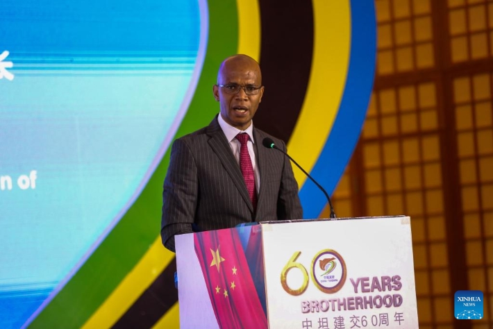 4月15日,坦桑尼亚外交与东非合作部部长马坎巴在坦桑尼亚达累斯萨拉姆举行的中坦建交60周年招待会现场致辞。