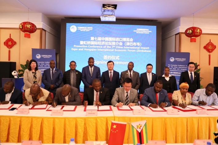 由中国国际进口博览局、中国驻津巴布韦大使馆、津巴布韦贸易促进机构等联合主办的第七届进博会暨虹桥论坛推介会16日在津巴布韦首都哈拉雷举行,津巴布韦政府官员和商界代表参会。