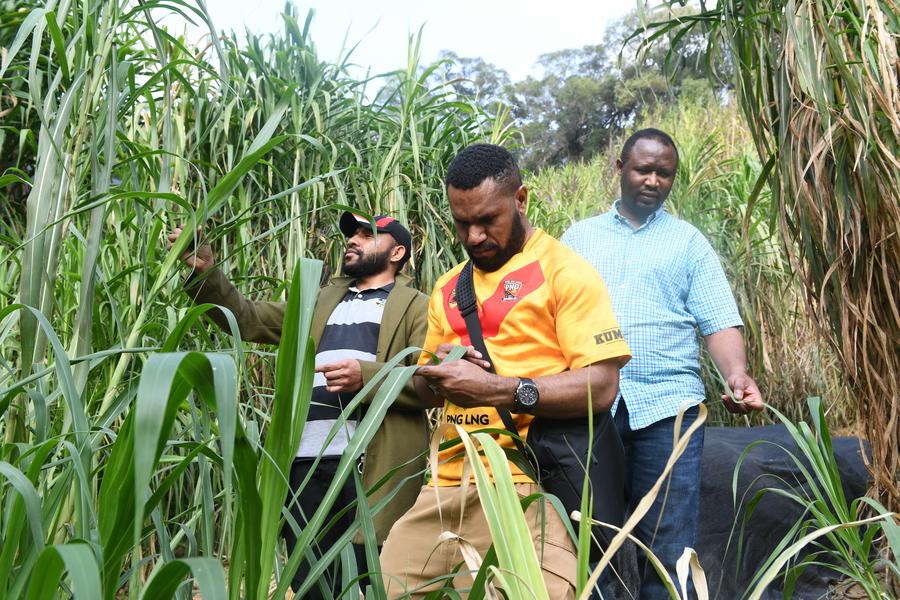 2024年3月28日,在位于福州的福建农林大学,来自卢旺达和巴布亚新几内亚的学生在“国际菌草苑”内查看菌草长势。(图片来源:新华社)