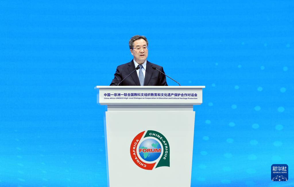 丁薛祥强调,中国愿同非方和联合国教科文组织一道,拓展深化教育合作,促进文化交流互鉴,助力中非携手推进现代化、共筑新时代全天候命运共同体。一是共同推进全球“2030年教育议程”加快实施,加强数字教育交流合作,帮助开展教师培训,深入推进“中非高校百校合作计划”,促进非洲教育现代化。二是共同赋能青年就业创业发展,深化职业教育合作,共建高水平鲁班工坊,开展“中文+职业技能”教育,培训非洲女性创业者,帮助更多非洲青年实现人生梦想。三是共同加强文化遗产保护,深入开展考古、古迹遗址保护与修复、专业人才培养与能力建设等领域合作,共同打击文化财产非法贩运,互设文化交流中心,互办文化艺术展览。中方将与联合国教科文组织合作设立遗产保护信托基金项目,帮助非洲提升文化遗产保护能力。