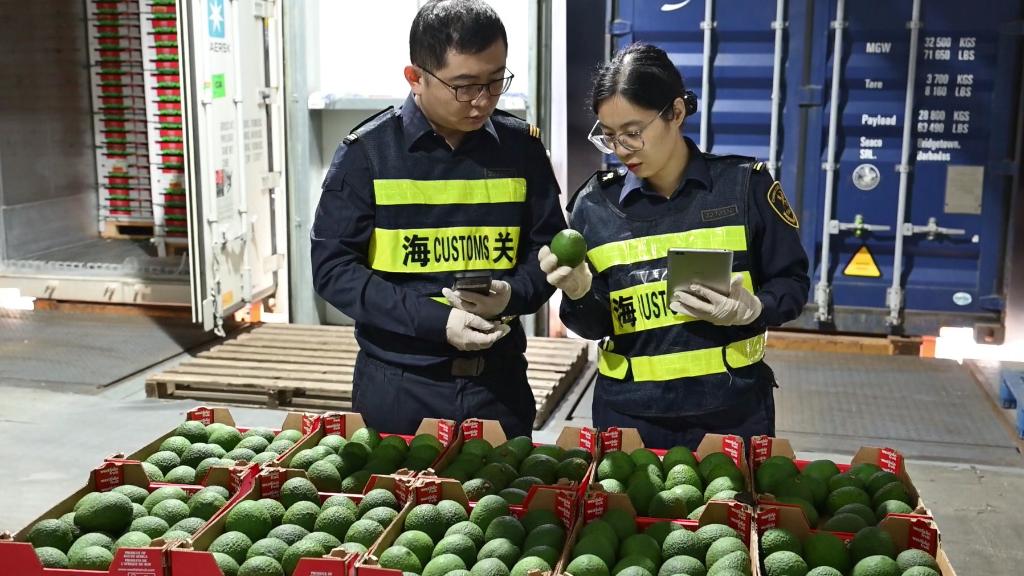 图为上海海关关员对中国首批自南非进口的牛油果进行现场查验。(图片来源:上海海关)