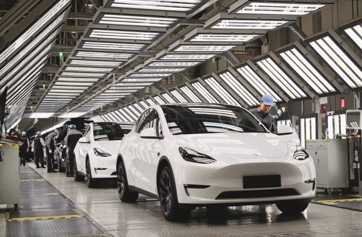 2023年12月22日,在特斯拉上海超级工厂内,工人在对出厂前的车辆进行漆面及门窗检测。(图片来源:新华社)