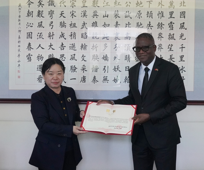 为强化智库建设,中心特别举行顾问聘任仪式,赵丽君主任向恩塔姆贝莱尼校长颁发聘书,正式聘任其担任欧非中心顾问专家。