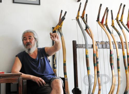 1958年出生的杨福喜没能看到家族生意的红火,那一年“聚元号”已经停止制作弓箭,改成木器店了,从小和斧刨为伴的杨福喜学到了一手好木工活,这也为他之后学习制作弓箭打下了基础。“虽然没见过父亲他们做弓箭,也没体验过弓箭铺里的气氛,但我却经常听父亲和大伯聊天时提起。这或许就是遗传,我骨子里对弓箭就有种亲切感,小时候经常摆弄家里收藏的弓箭。我母亲常说我是‘天生好这个’。”杨福喜虽然这样说,但还是难掩一丝遗憾。