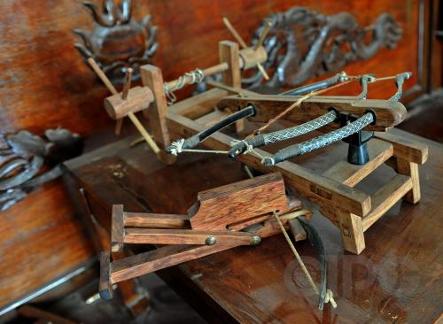 杨福喜介绍说,因为父亲在世时,自己总会有一种可以依靠感。哪道工序复杂,自己做不好时,就会让父亲来做。“这就是我们说的‘拐棍手艺’,意思是总是拄根拐棍丢不掉。”他指着墙上的一把弩弓说,“比如这把弩,父亲在世时我从没亲手做过它的扳机,虽然父亲给我讲过多次,理论上我也知道它的制作工艺,但并没有亲手做过。父亲去世后,我只能根据记忆自己琢磨,琢磨来琢磨去,终于自己做出来了。”就是靠着这股子钻劲,杨福喜终于熟练地掌握了制作弓箭的全套技术。