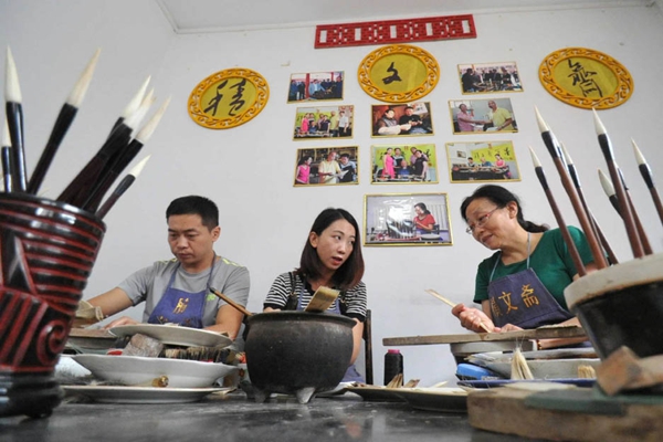 山西省百年“文斋笔墨庄”第四代传承人王刚(左)、赵苏梅(中)和第三代传承人55岁的张喜婷(右)在作坊中制作绛州毛笔
