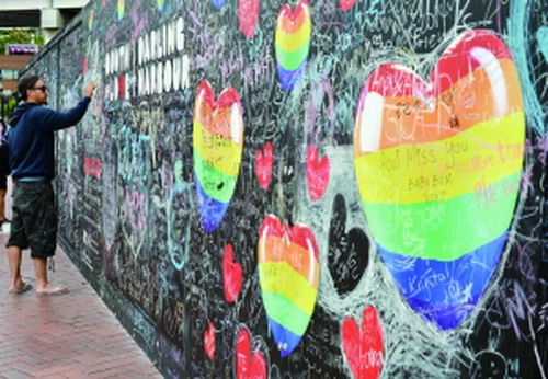 2014年2月13日,在澳大利亚悉尼,一名男子在一面写满情人节留言的涂鸦墙上写字。 新华/法新