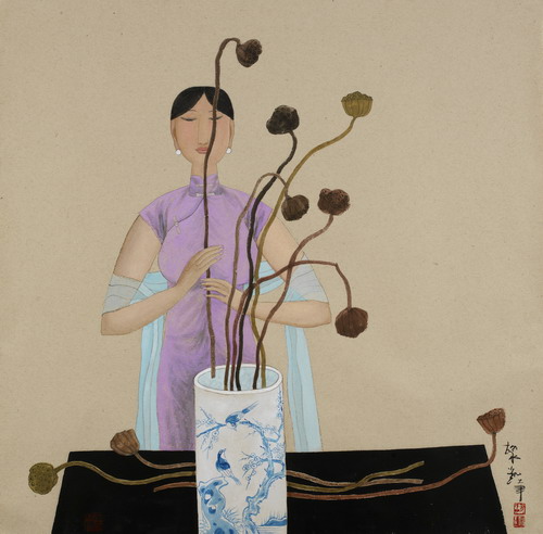 胡永凯的绘画面貌正是基于这种认识逐渐形成的。他把在学校学到的手艺和掌握的造型技巧隐藏在夸张、变形、带有装饰性的绘画语言中,讲究绘画语言的形式美感。题材多为青春女性,劳作的现代农女和深居宅院的古代闺秀,后者居多。作品构思缜密、构图严谨,色彩丰富,敢于用鲜艳色,但十分注意色调的和谐。画面整体感强,又不乏生动、有趣的细节。细节描写丝毫不影响画面的整体,而在整体格局中发挥“亮点”的作用,这不能不说是胡永凯的艺术匠心所在。