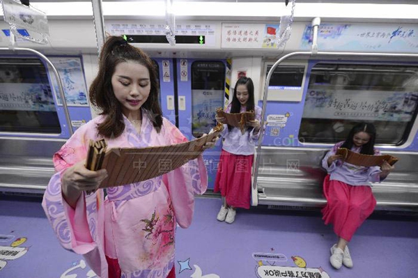几位身着古装的重庆酉阳桃花源女孩来到湖南长沙地铁2号线车厢内朗诵起了陶渊明名篇《桃花源记》,以此弘扬传统国学