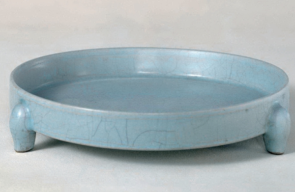 现藏于北京故宫博物院,承盘圆口,浅腹,平底,下承以三足。里外施天青色釉,釉面开细碎纹片。外底满釉,有5个细小支烧钉痕。乾隆皇帝曾为其题诗一首,由宫廷御作匠师以楷书镌刻于器物外底。诗曰:“紫土陶成铁足三,寓言得一此中函。易辞本契退藏理,宋诏胡夸切事谈。”