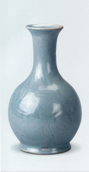 现藏河南省文物考古研究所。此瓶敞口细颈,鼓腹圈足,颈部及腹部剔刻折枝莲花纹。器表满施天蓝釉,釉层匀净莹润,开片疏密有致。瓶的圈足底部露胎,并沾有细小砂粒,显系垫烧而成。造型秀丽,釉面光亮,器表配以若隐若现的刻花装饰,为汝窑传世品中所未见。