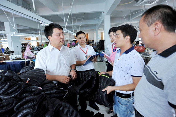 江西省万年县农村信用合作联社员工来到当地工业园区的服装企业,现场了解企业生产经营情况