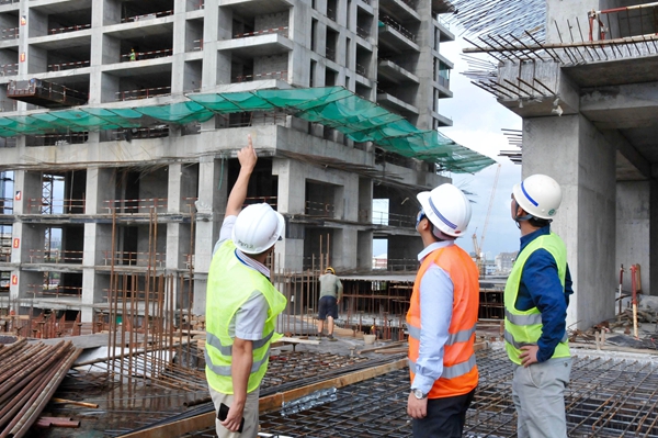 2016年6月28日,在斯里兰卡科伦坡,中国港湾斯里兰卡区域公司总经理张晓强(中)在香格里拉二期、三期项目现场和同事交流