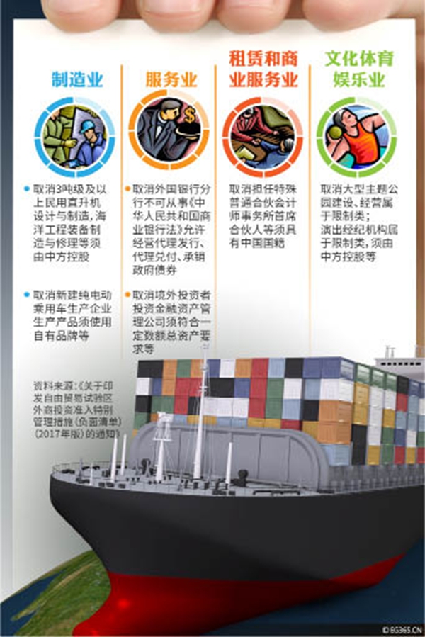 2017年6月5日,国务院办公厅通知下发《自由贸易试验区外商投资准入特别管理措施(负面清单)(2017年版)》,与上一版相比,一举取消了10个条目、27项外资市场准入限制措施。