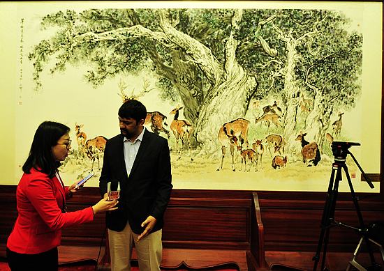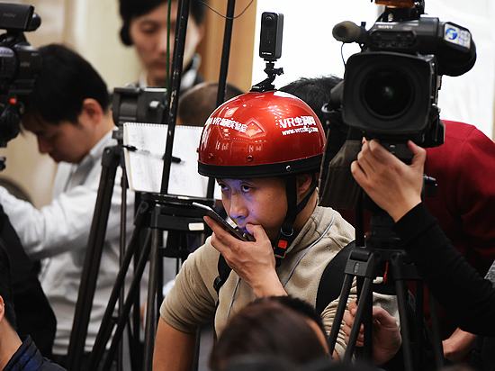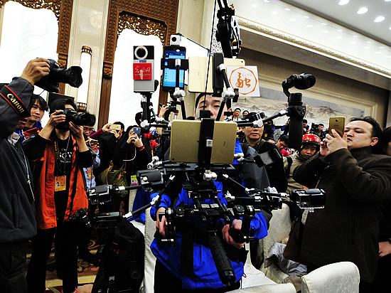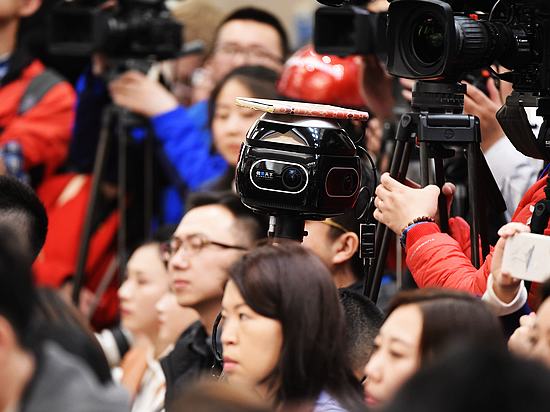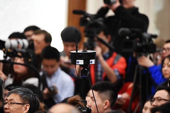 2017年3月2日,一家媒体使用的多媒体“钢铁侠”吸引了众多媒体关注。共有3000多名中外记者采访报道2017全国“两会”,在媒体“大战”中,各家媒体各显神通,既有全景、VR、直播等高科技手段,也有记者举着手写采访本提问。《今日中国》董宁摄影报道。