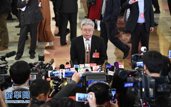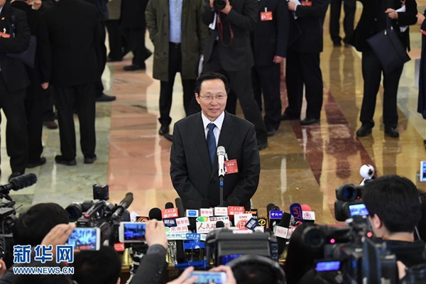3月5日,第十二届全国人民代表大会第五次会议在北京人民大会堂开幕。这是国家外汇管理局局长潘功胜接受采访。 新华社记者 赵颖全 摄