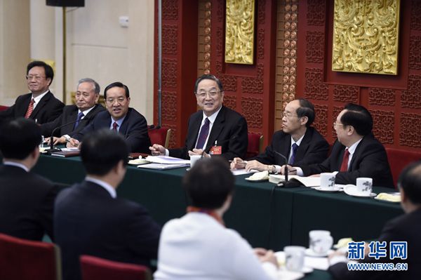 3月5日,中共中央政治局常委、全国政协主席俞正声参加十二届全国人大五次会议湖北代表团的审议。 新华社记者 燕雁 摄