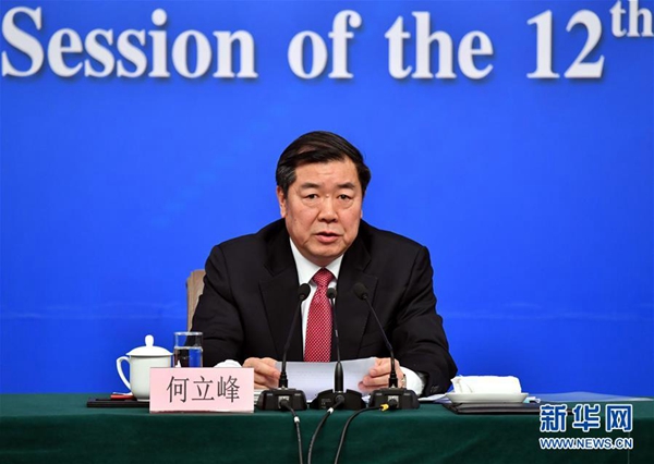 3月6日,十二届全国人大五次会议新闻中心举行记者会,邀请国家发展和改革委员会主任何立峰、副主任张勇、副主任宁吉喆就“经济社会发展与宏观调控”的相关问题回答中外记者的提问。这是何立峰在回答记者提问。新华社记者 李鑫 摄