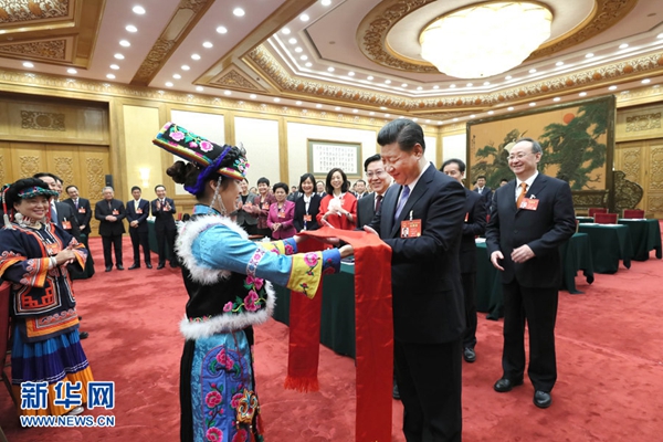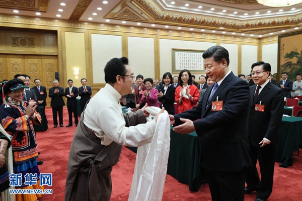 3月8日,中共中央总书记、国家主席、中央军委主席习近平参加十二届全国人大五次会议四川代表团的审议。习近平走进会场时,身着民族服装的藏族、彝族、羌族代表向总书记问好。这是藏族代表献上洁白的哈达。新华社记者 兰红光 摄
