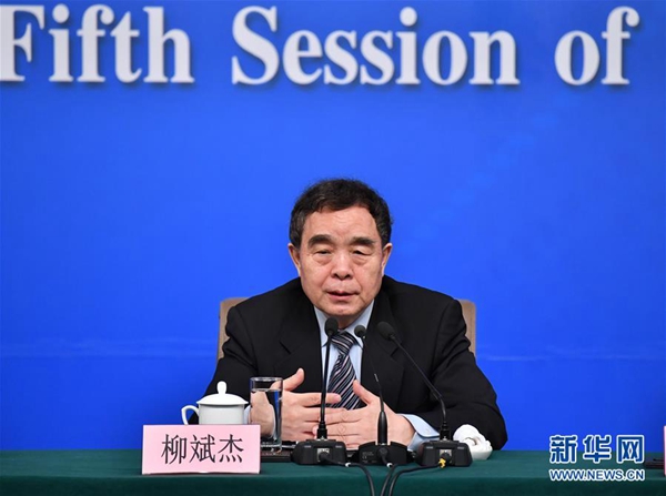 3月10日,十二届全国人大五次会议新闻中心举行记者会,邀请全国人大教科文卫委员会主任委员柳斌杰、内务司法委员会副主任委员王胜明、财政经济委员会副主任委员尹中卿、环境与资源保护委员会副主任委员袁驷、全国人大常委会预算工作委员会副主任刘修文、全国人大常委会办公厅秘书局巡视员傅文杰就“人大监督工作”的相关问题回答中外记者的提问。这是柳斌杰在回答记者提问。新华社记者 李鑫 摄