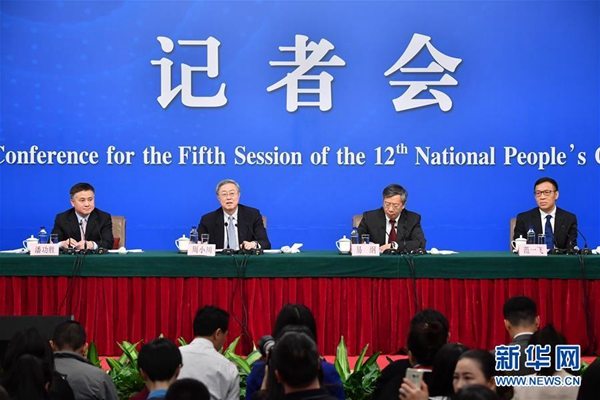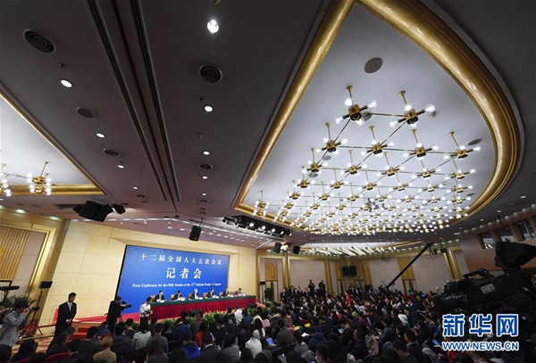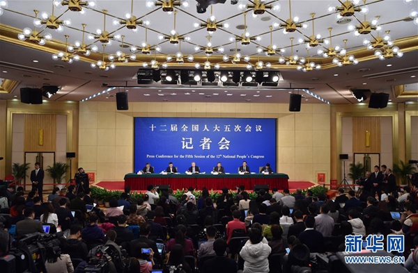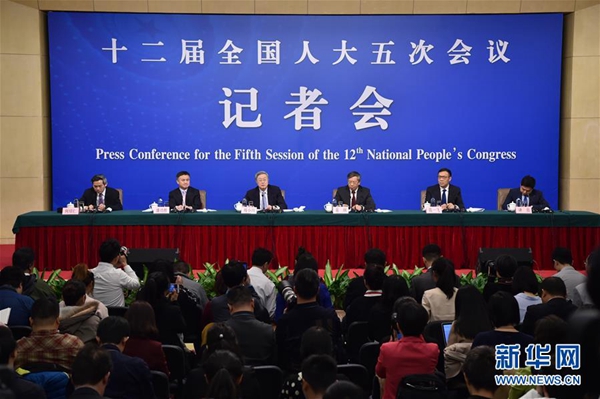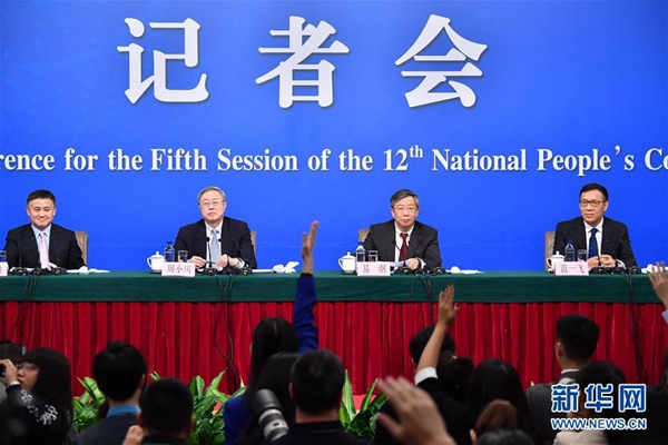 3月10日,十二届全国人大五次会议新闻中心举行记者会,邀请中国人民银行行长周小川、副行长易纲、副行长兼国家外汇管理局局长潘功胜、副行长范一飞就“金融改革与发展”的相关问题回答中外记者的提问。新华社记者陈晔华摄