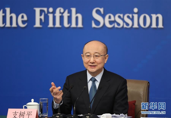 3月14日,十二届全国人大五次会议新闻中心举行记者会,邀请国家质检总局局长支树平、副局长兼国家认证认可监督管理委员会主任孙大伟、国家标准化管理委员会主任田世宏就“质量提升”的相关问题回答中外记者的提问。这是支树平在回答记者提问。新华社记者 陈建力 摄