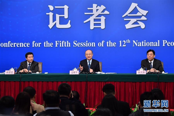 3月14日,十二届全国人大五次会议新闻中心举行记者会,邀请国家质检总局局长支树平、副局长兼国家认证认可监督管理委员会主任孙大伟、国家标准化管理委员会主任田世宏就“质量提升”的相关问题回答中外记者的提问。新华社记者 赵颖全 摄