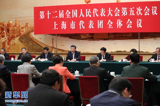 3月5日,中共中央总书记、国家主席、中央军委主席习近平参加十二届全国人大五次会议上海代表团的审议。新华社记者 王晔 摄