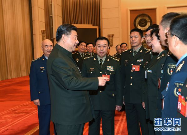 | 3月12日,中共中央总书记、国家主席、中央军委主席习近平出席十二届全国人大五次会议解放军代表团全体会议并发表重要讲话。这是会议结束时,习近平亲切接见来自基层部队的部分军队人大代表。新华社记者 李刚 摄 |