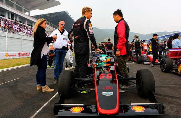 2017年10月29日,吴一夫和父母及中国技师在宁波F4年终决赛上就车辆问题进行交流。