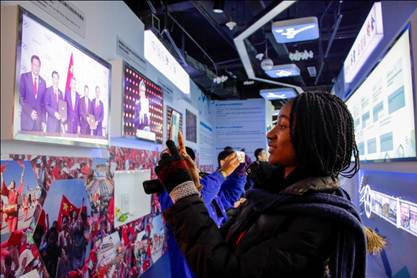 北京师范大学新兴市场研究院的外国留学生正在冰雪博物馆参观,详细了解北京和张家口联合申办冬奥会的全过程。